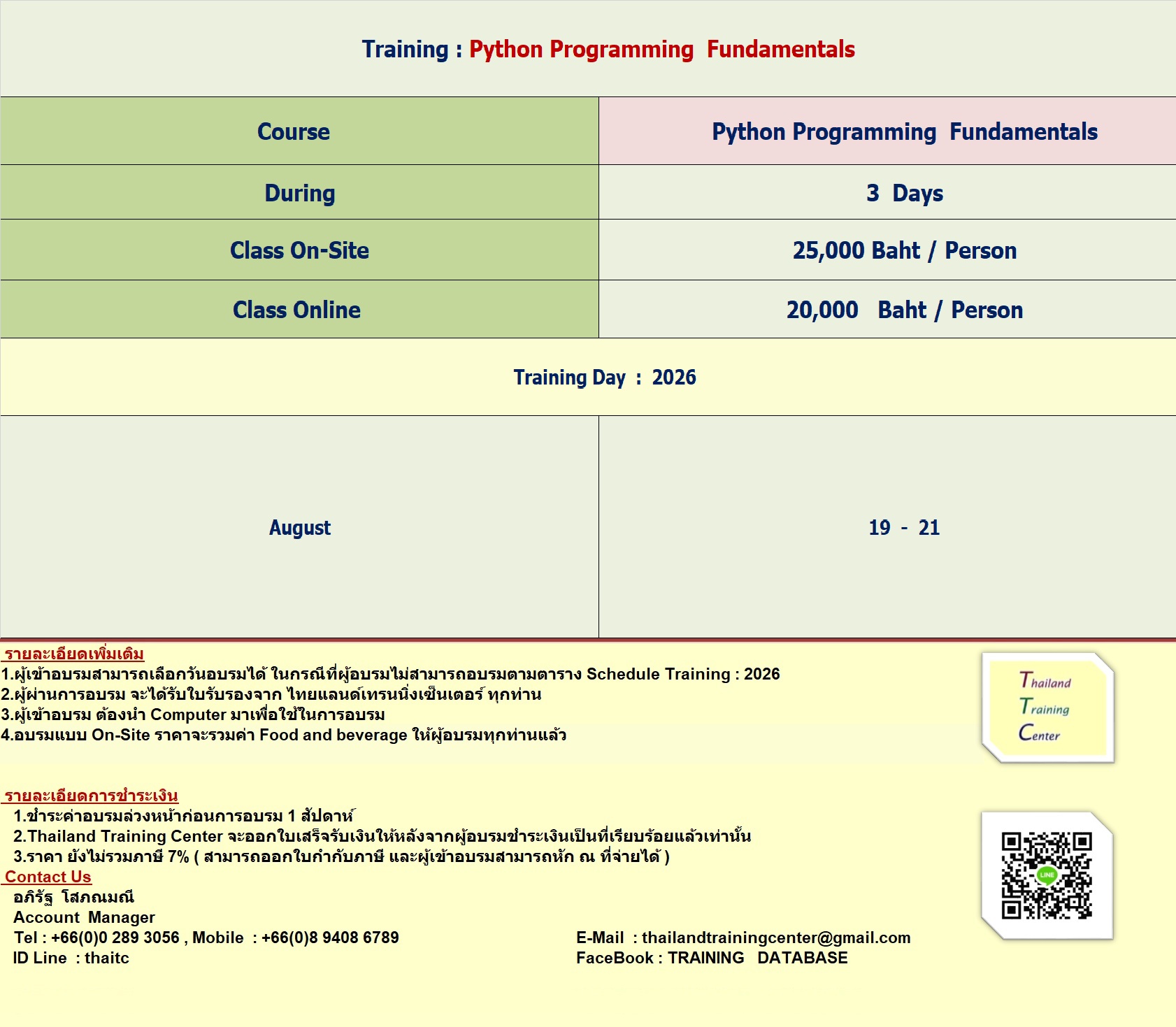 หลักสูตร Python Programming Fundamentals จะช่วยให้คุณเข้าใจพื้นฐานของการเขียนโปรแกรมด้วย Python และเป็นพื้นฐานที่ดีในการต่อยอดไปสู่ระดับขั้นสูงของการเขียนโปรแกรมด้วยภาษา Python หรือเทคโนโลยีอื่นๆ ที่ใช้ Python เป็นภาษาหลัก หลักสูตร Python Programming Fundamentals เป็นหลักสูตรที่ออกแบบมาเพื่อให้ความรู้และทักษะพื้นฐานในการเขียนโปรแกรมด้วยภาษาPython ซึ่งจะมุ่งเน้นในการสอนเรื่องพื้นฐานเช่นการประกาศตัวแปร การทำงานกับตัวแปร การควบคุมการทำงานของโปรแกรมด้วยคำสั่งเงื่อนไขและการทำซ้ำ การใช้ฟังก์ชันพื้นฐาน เป็นต้น